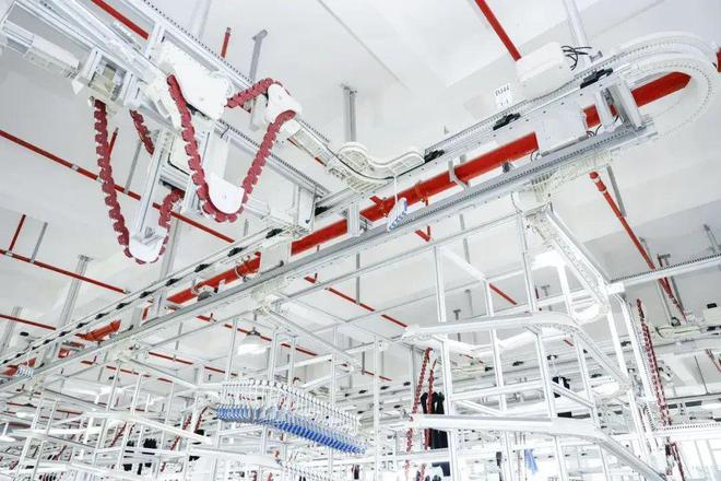 在特步智能工厂,你能看到智能吊挂系统像高铁轨道一样穿梭于三层楼中,显得十分壮观。各种颜色、各种材质和不同大小的布料批量裁剪完成吊挂在衣架上,然后再坐上“高铁”,并被精准地传送到指定的工位上。