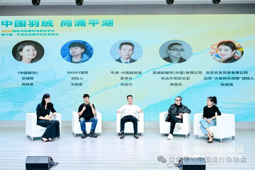 在最后的对话环节,《中国服饰》总编辑刘晓青作为对话主持人,与平湖中国服装城董事长胡国华,RAXXY瑞希品牌创始人沈威廉,真维斯服饰(中国)有限公司商品开发部总监黄国东,北京衣吉贸易有限公司品牌“大象和长颈鹿”创始人张微微共同对话当下羽绒服市场的发展、设计与创新,并对未来的羽绒服市场进行预测与展望。平湖中国服装城董事长胡国华说:“平湖之前是服装名城,之前都是外贸加工,现在成为全国羽绒服的供应基地,还有很多海外国家的客商前来订货,说明平湖羽绒服产业的强大。这几年服装城对原创设计也非常重视。户外冲锋衣、儿童羽绒服呈现个性化、时尚化趋势,女款开发更是以每年新款都超过2万多款。近几年平湖市政府对企业也很支持,企业们面对竞争激烈的市场,也倒逼自己创新,服装城囊括了羽绒服产业链各个环节的企业,从而将产业链做到了极致性价比,这也是其他外地羽绒服企业所无法比拟的。”