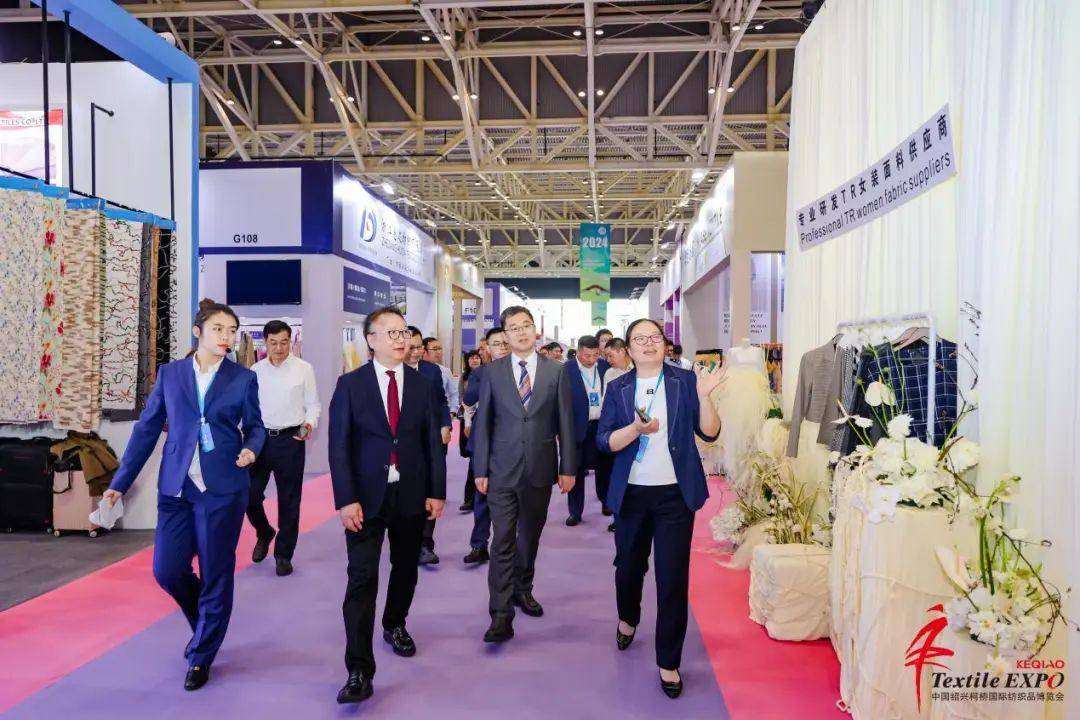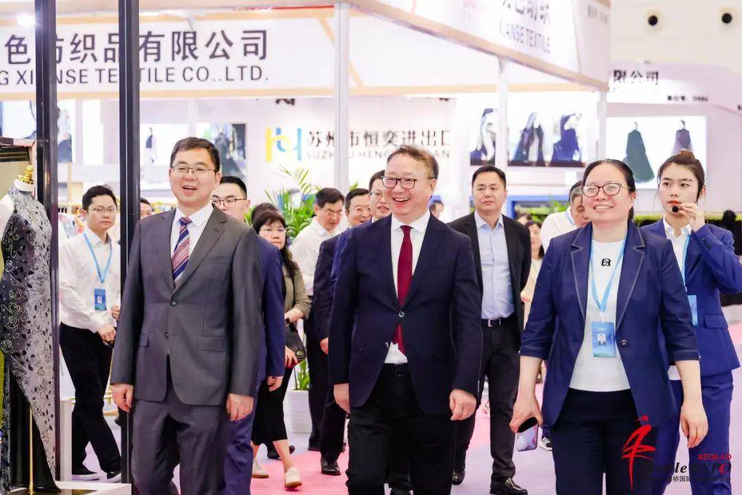 展会首日,中国纺织工业联合会会长孙瑞哲等行业协会领导,以及柯桥区领导陈豪、袁建、朱晓董、吴海洋、袁笑文等参观展会现场。