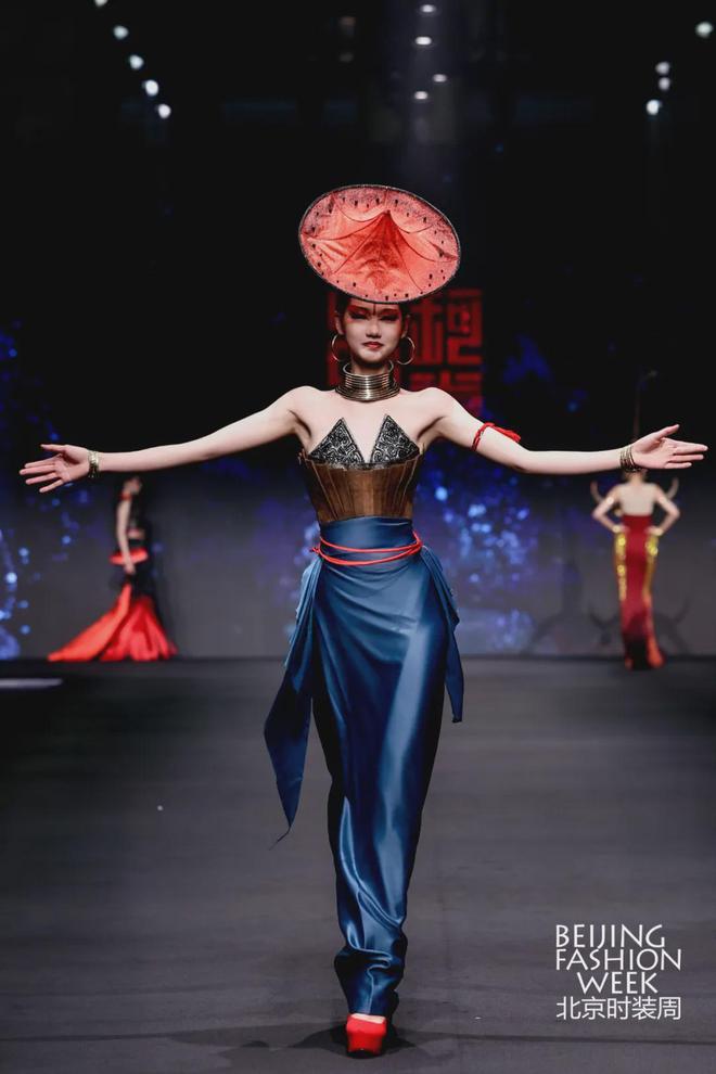非遗技艺在张珂嘉的设计中也得到了活化利用。他以设计之形接纳技艺之魂,例如对花腰傣竹编斗笠进行尺寸的重新设计,将其纳入主秀造型。同时,辅以象征天地与自然的 “宇宙树”,让这些承载着多民族文化与记忆的元素再次焕发出新的生机,绽放出永恒的魅力。